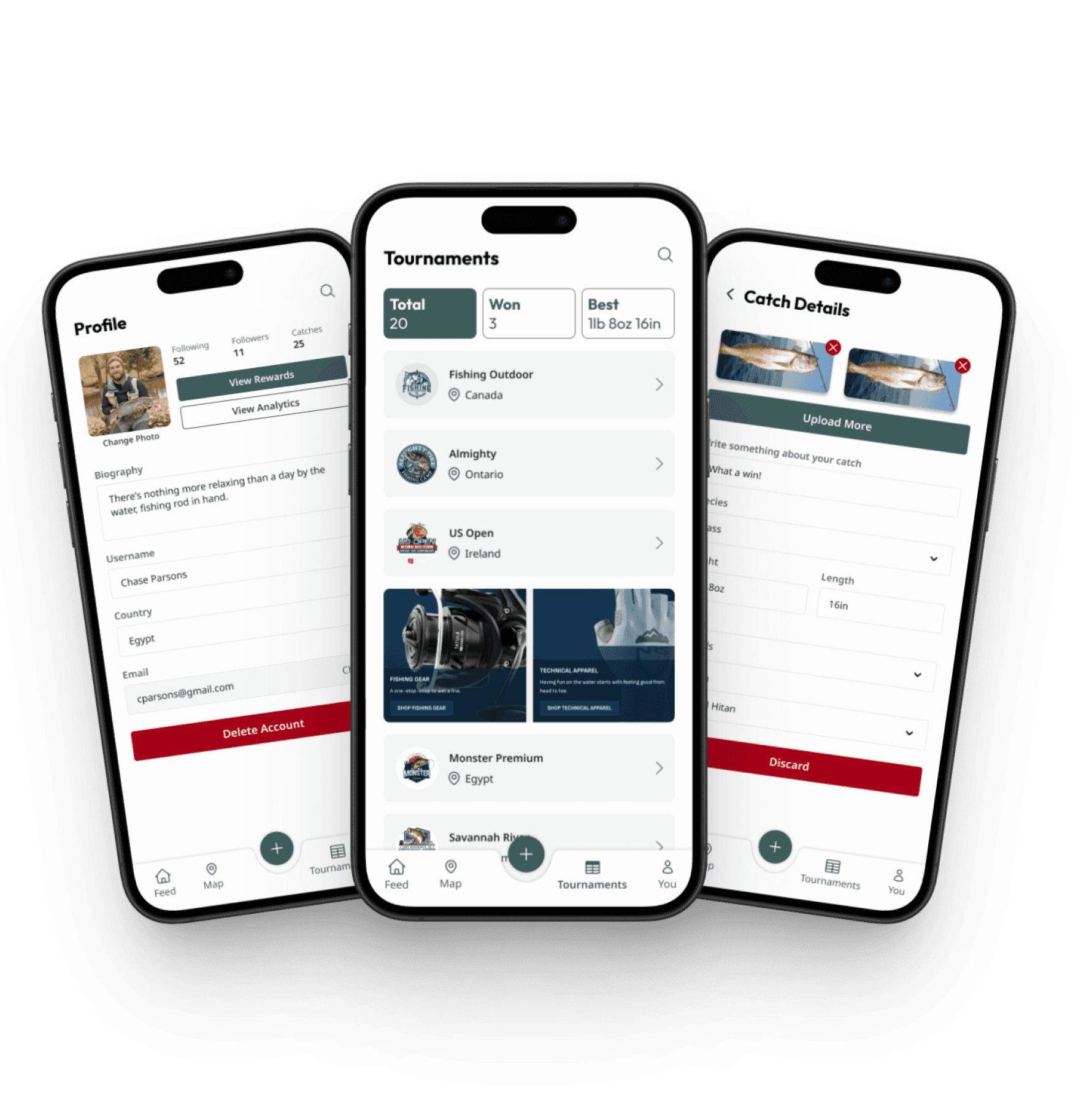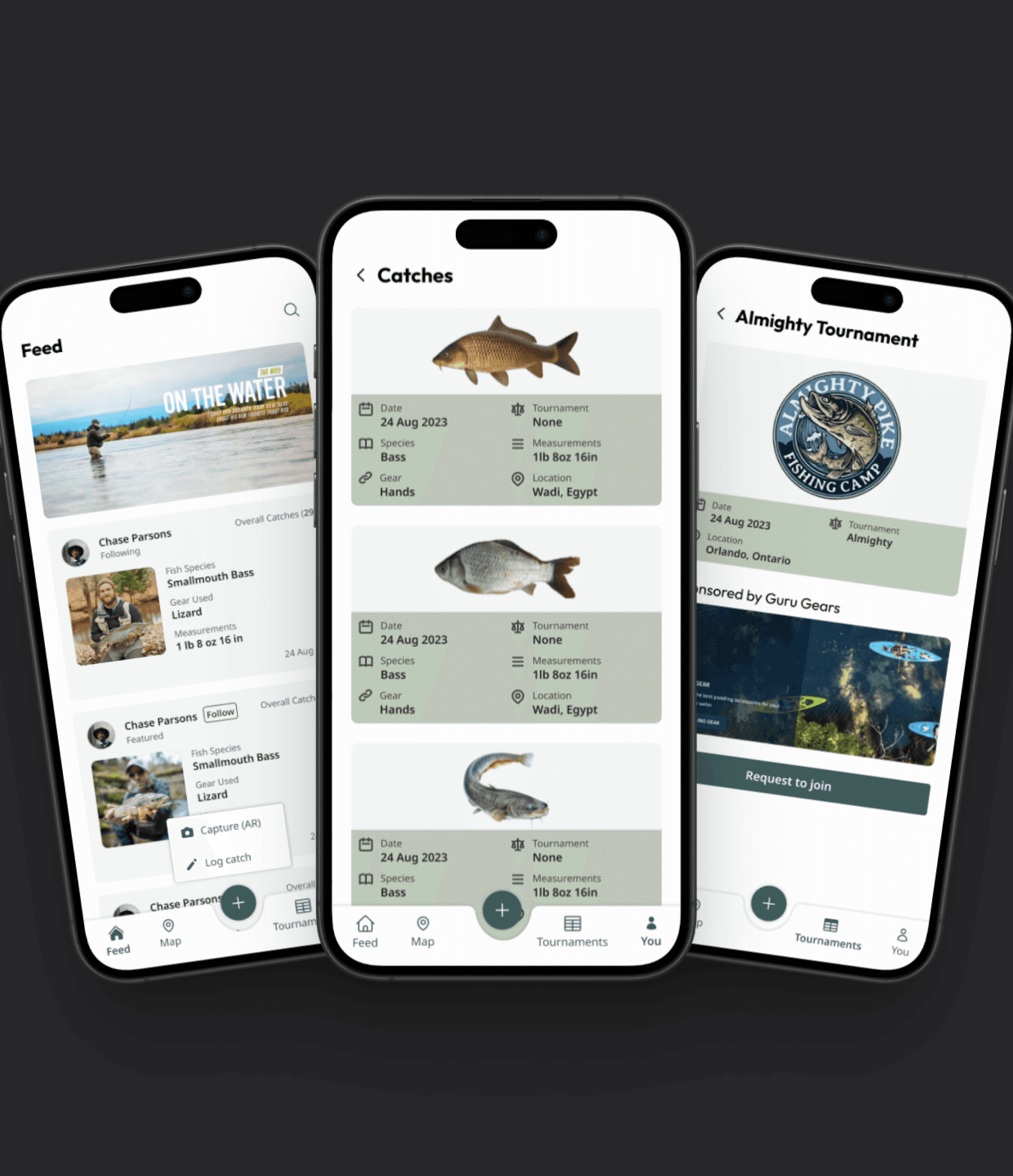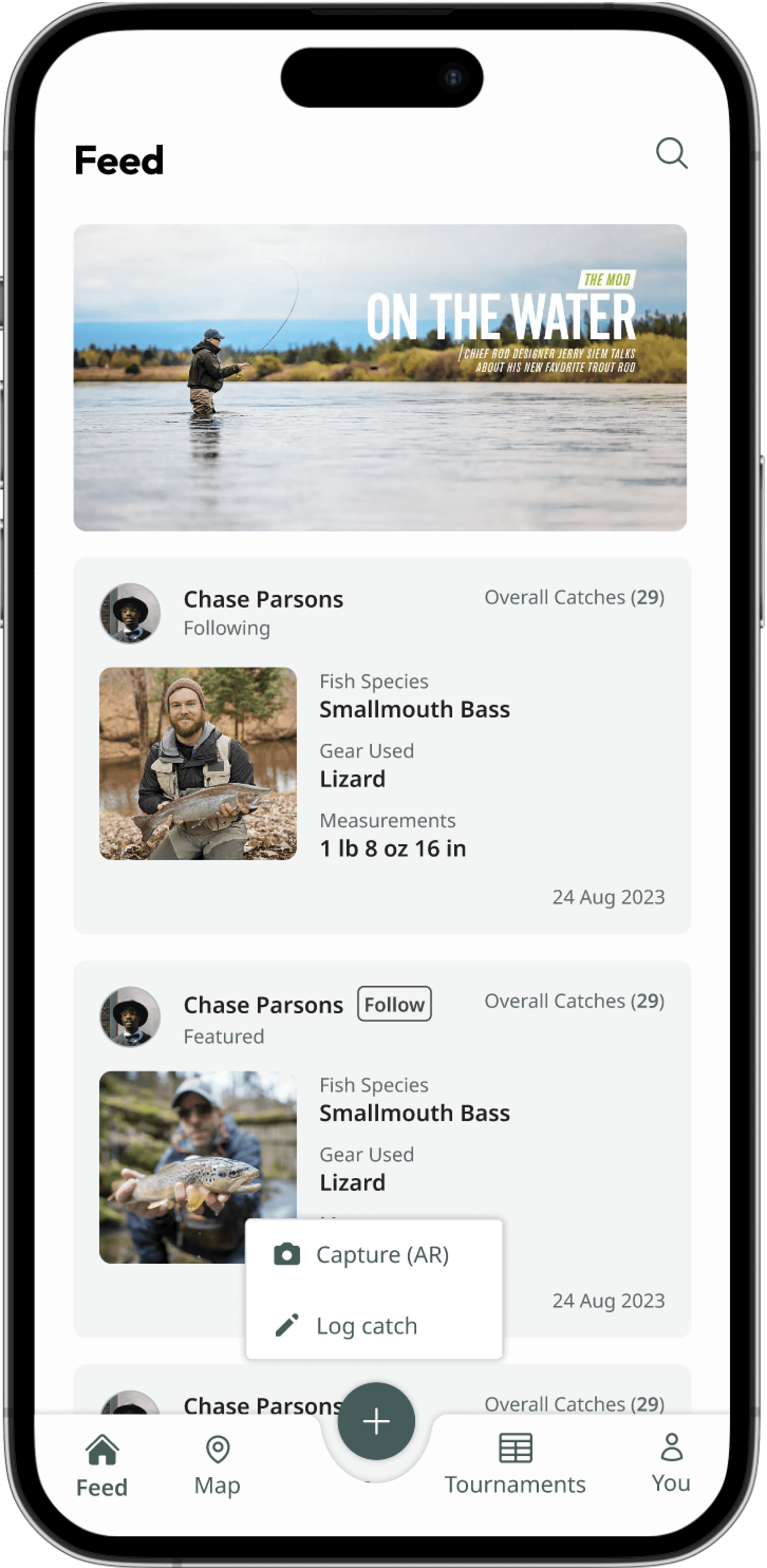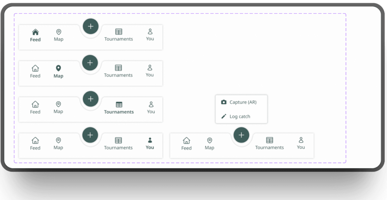 I focused on creating a simple flow for adding catches quickly, important for users who might be on the move, while still allowing them to view and explore tournament stats and peer activity.