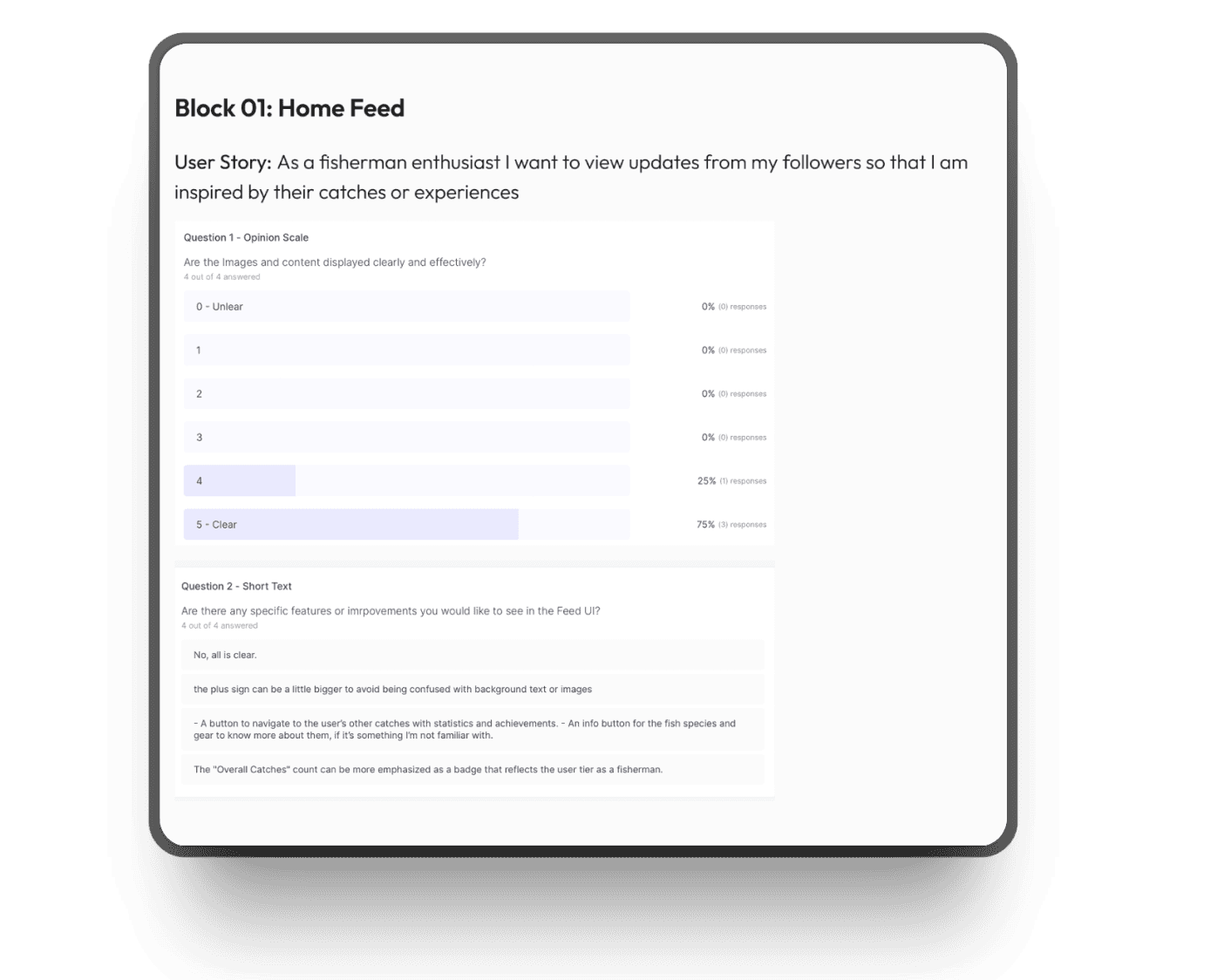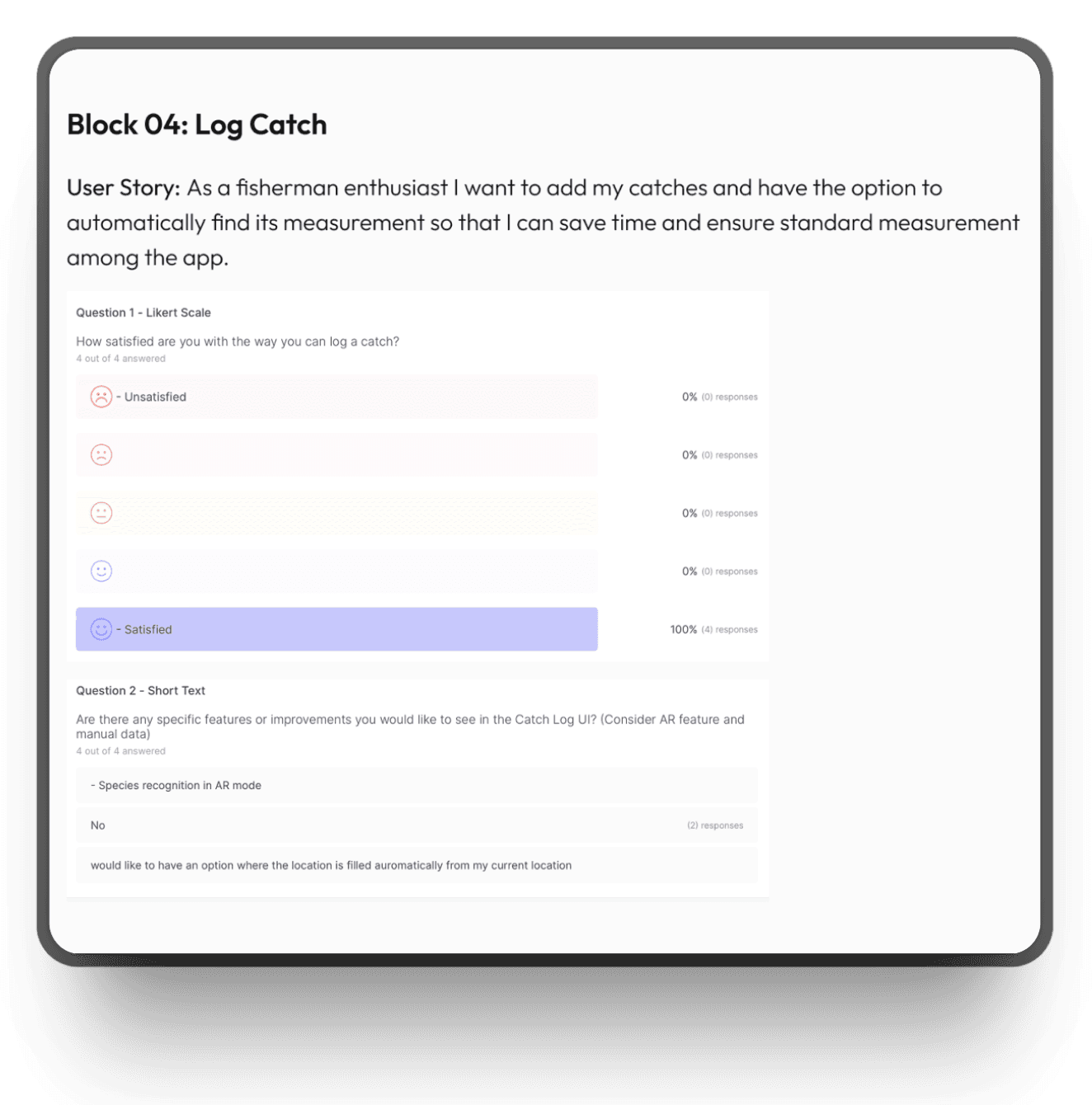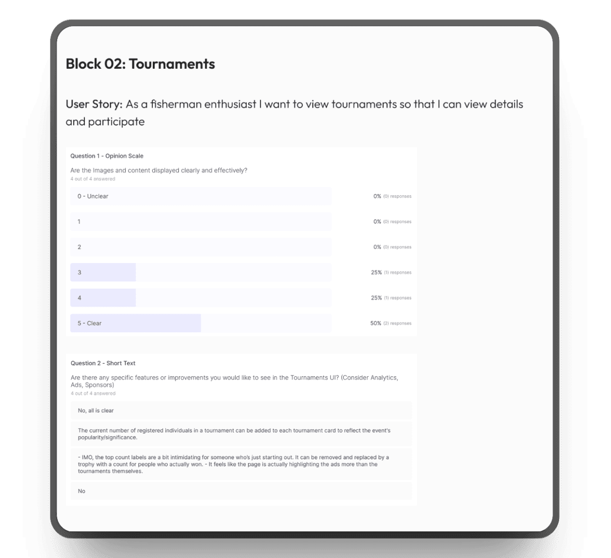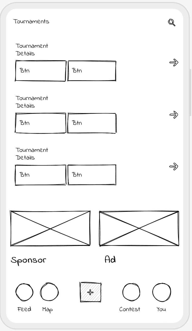 I focused on creating a simple flow for adding catches quickly, important for users who might be on the move, while still allowing them to view and explore tournament stats and peer activity.