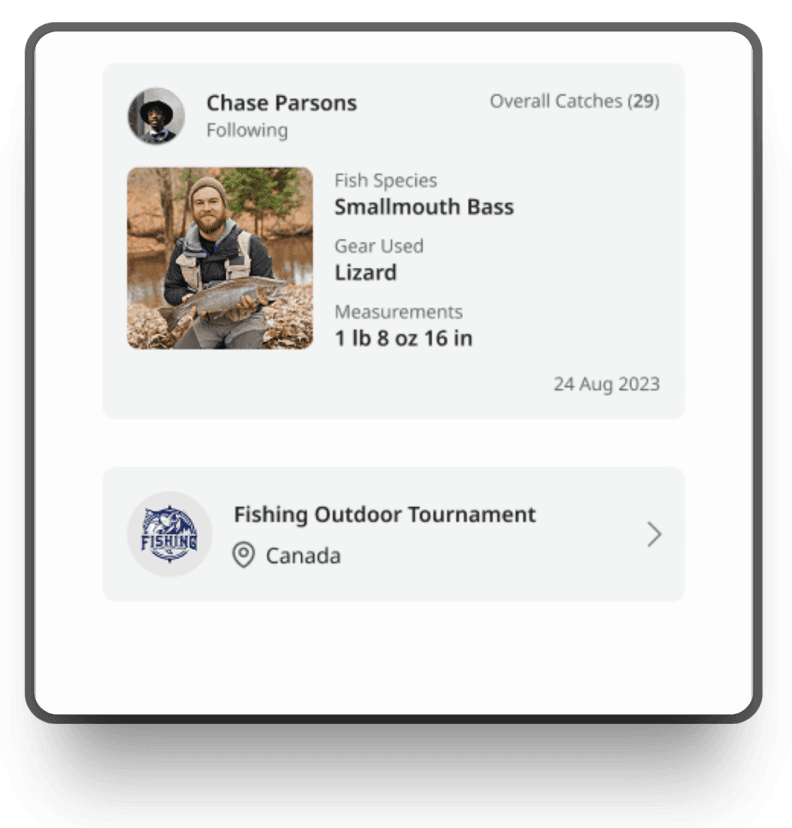 Visual cues like badges, charts, and imagery made the data more engaging, while clear CTAs guided users through each interaction, from logging a new catch to browsing tournament leaderboards.